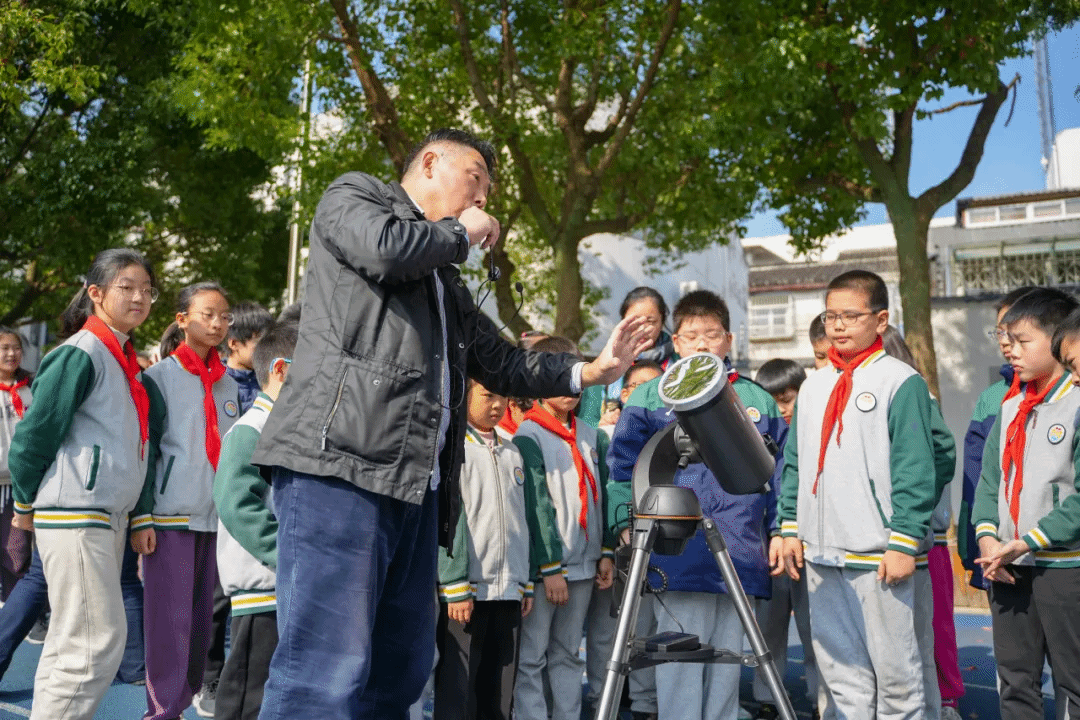 在苏州市东中市实验小学校科技节到来之际,中高年级学生在天文社团的程老师带领下,参加了观测太阳黑子的活动。